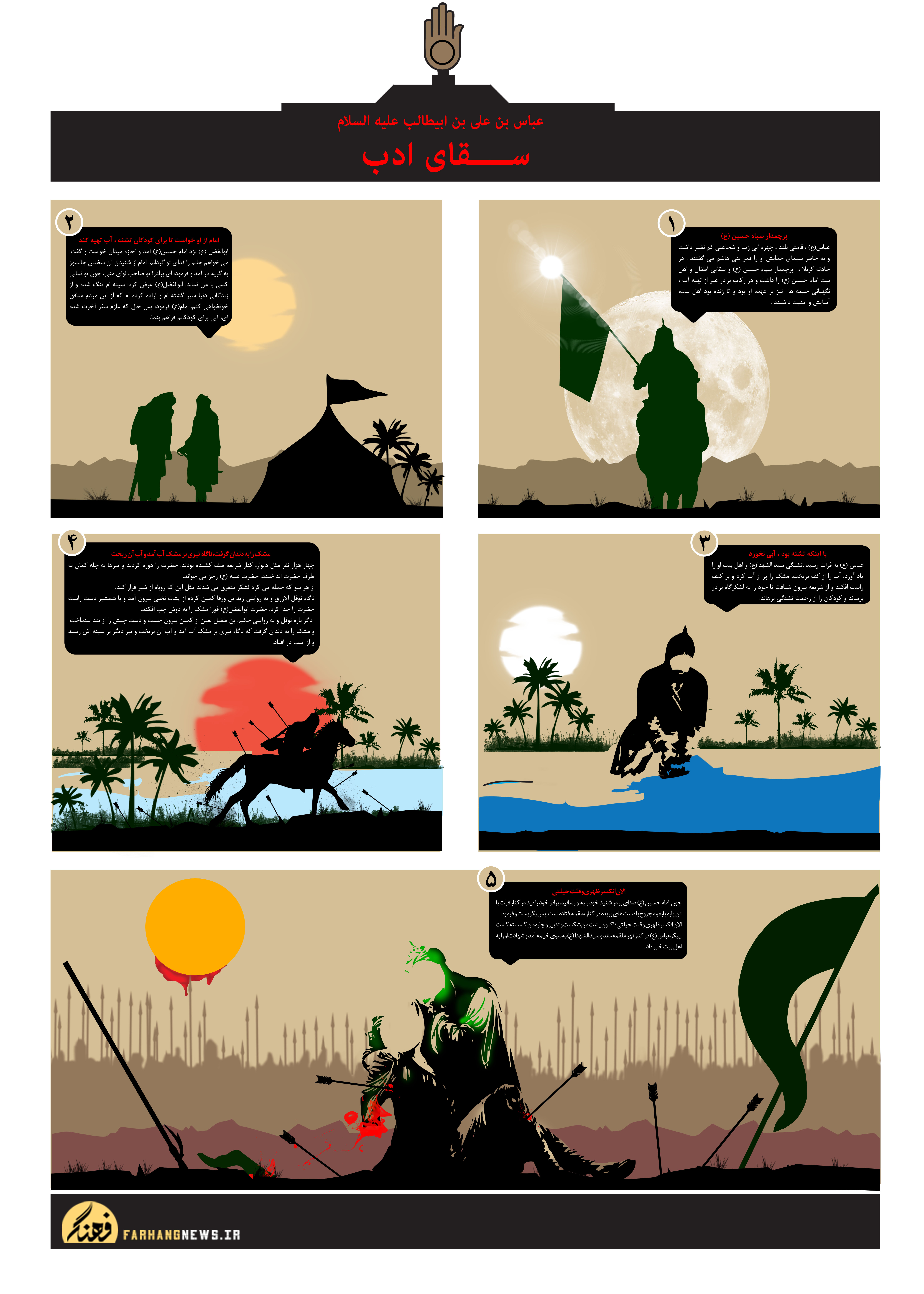 عباس(ع) خدمت امام می رسد و آنچه از لشکر عمر سعد دید به امام رساند حضرت عباس ناگهان صدای کودکان را شنید که فریاد می زدند العطش العطش برای حضرت عباس خیلی سخت بود. صدای العطش کودکان را بشنود و کاری نکند از این رو سوار اسب شد و نیزه به دست گرفت و مشک آبی را همراه خود برد و به طرف شط فرات راهی شد شریعه فرات با 4 هزار نیرو محافظت می شد اسب را داخل آب می برد. اول مشک را پر از آب می کند و به دوش می اندازد ، حضرت عباس تشنه است و هوا بسیار گرم. زمان واقعه عاشورا به روایتی دیگر مهرماه بوده است او جنگیده تا به فرات رسیده خسته و کوفته وارد آب شده، همانطوریکه سوار بر اسب است آب تا زیر شکم اسب را فرا می گیرد، دست زیر آب می برد مقداری آب با دو دستش بر می دارد تا نزدیکیهای لبانش می آورد آنهایی که از دور ناظر بودند ، گفته اند: اندکی تامل کرد بعد دیدیم آب را نخورد و روی آب فرات ریخت هیچکس نفهمید چرا قمر بنی هاشم آب نخورد.